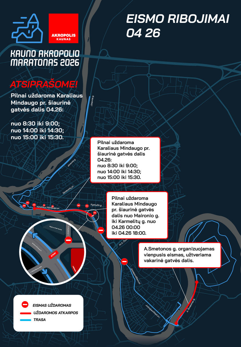 Balandžio 26 d., sekmadienį, Kaune vyks didžiausias miesto bėgimo renginys – Kauno „Akropolio“ maratonas, kurio metu bus ribojamas ar uždaromas transporto eismas dalyje miesto gatvių. Eismo ribojimai įsigalios nuo balandžio 26 d. 00.00 val. ir truks iki 17.00 val.
